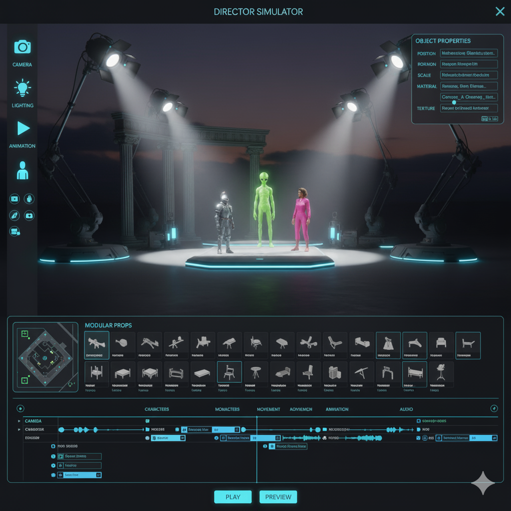 Director Simulator là một sandbox sáng tạo, nơi bạn trở thành đạo diễn trên một phim trường ảo có thể tùy biến hoàn toàn. Tự xây dựng bối cảnh, điều khiển diễn viên, chỉnh ánh sáng và quay những thước phim đúng với ý tưởng của bạn.